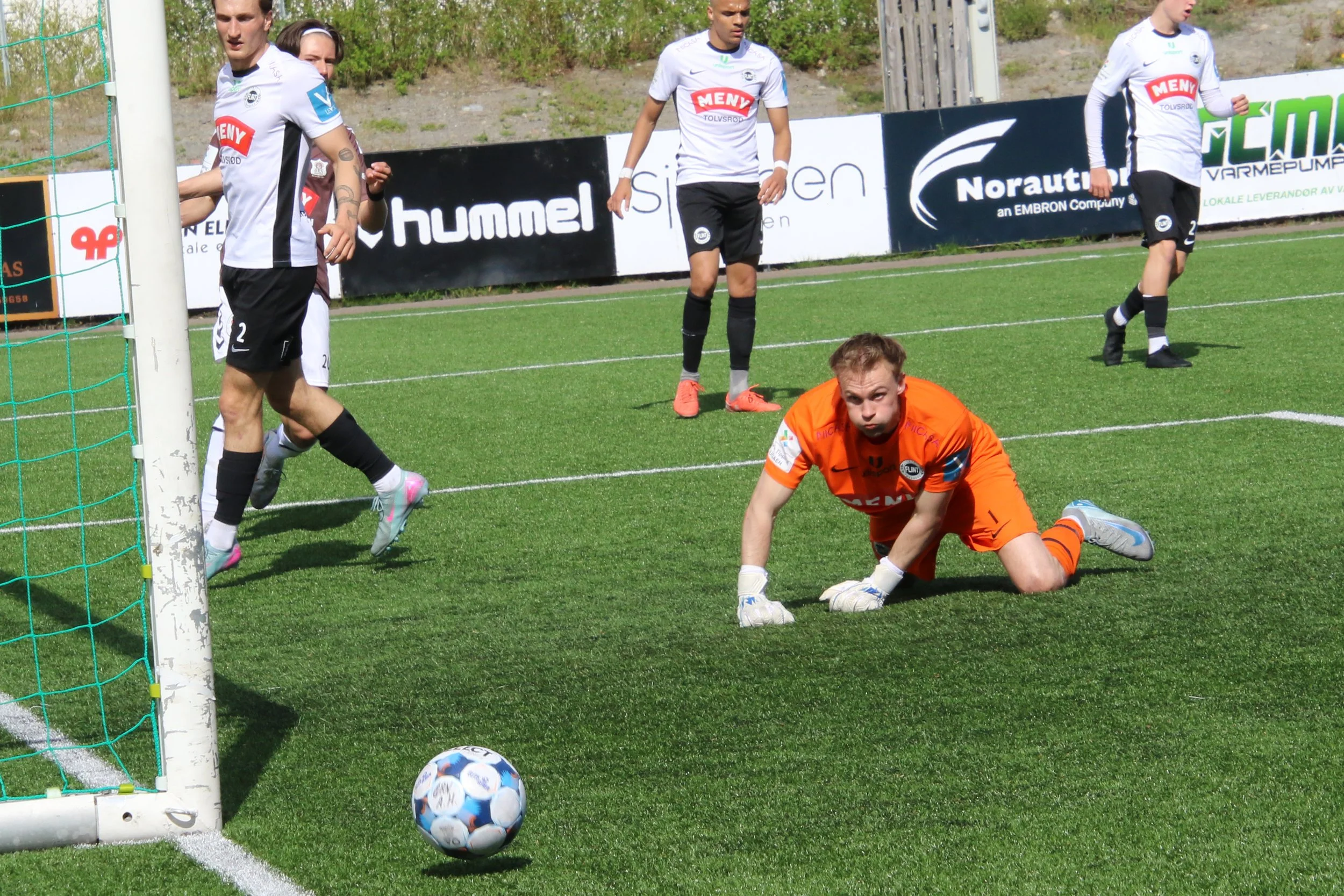 Flints keeper puster letta ut når ballen er på vei utafor mål, ved en av Ørns mange sjanser i Lystlunden
