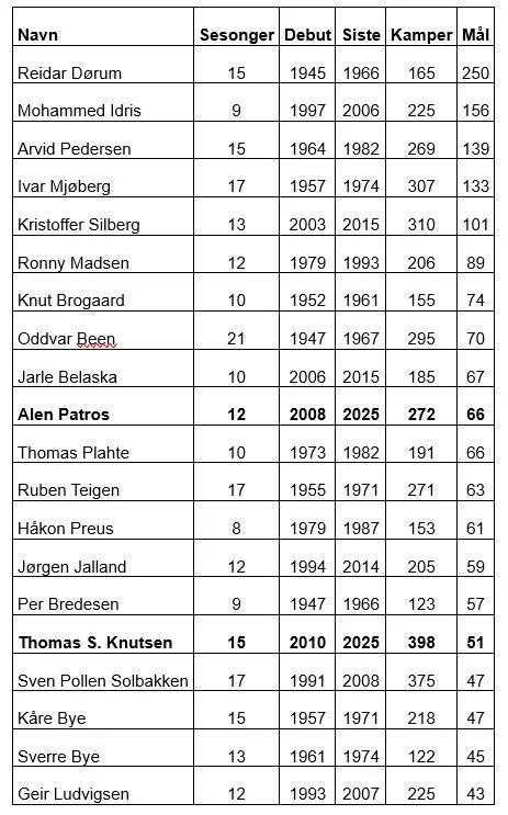 Selvsagt topper Thomas Knutsen suverent i antall kamper, med Alen Patros og Arnar Førsund et godt stykke bak. Det er sju spillere som har spilt over 100 kamper.