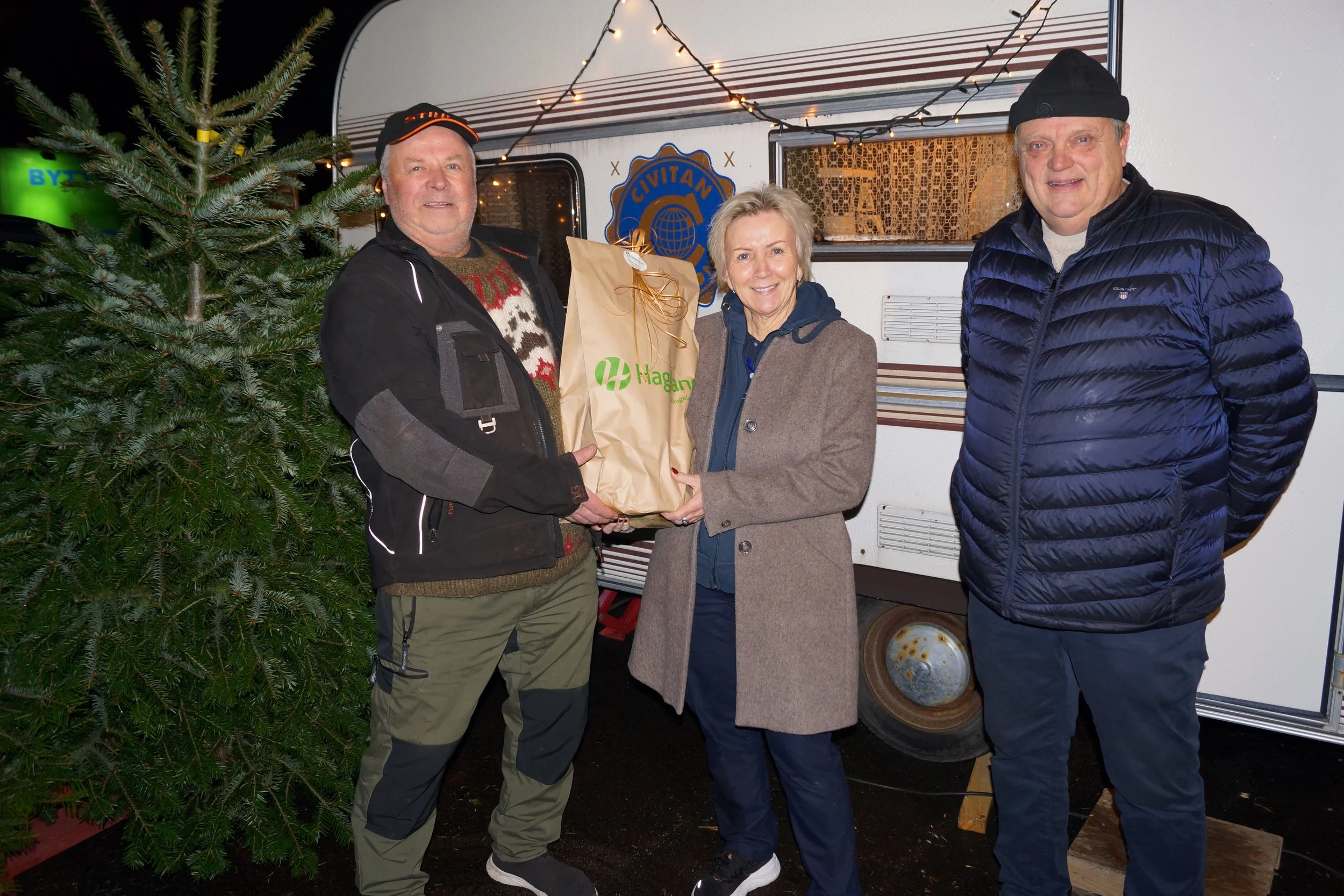 Erik Sagvik er vel ute av juletrepakkemaskina og har blitt tatt imot av Bent Lærum og Ståle Nyrud i Civitan