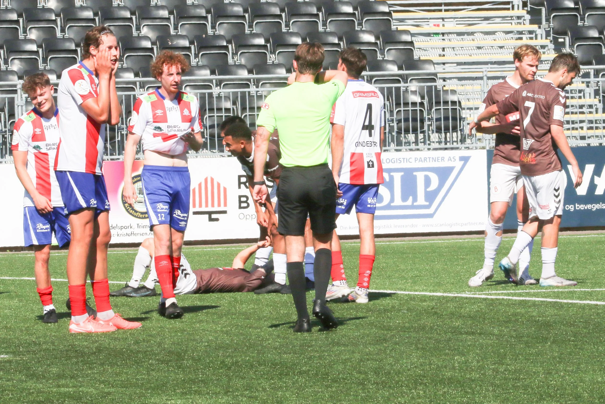 Alex Krawiec ligger nede etter å ha blitt takla av en Kvikspiller som selvsagt er helt uforstående