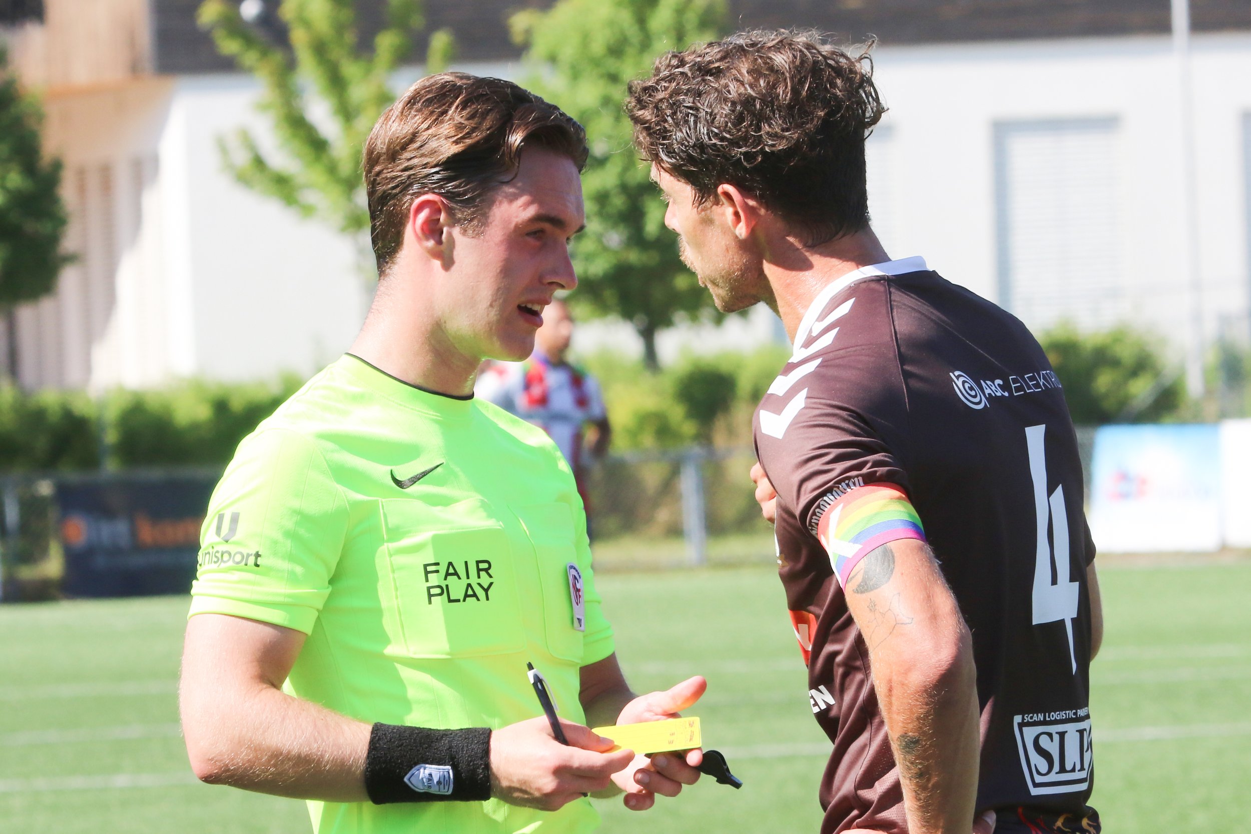 Kaptein Arnar Førsund prøver å ha dialog med dommer Marius Tvede Hansen, men blir belønna med gult kort - Kvikspilleren slapp unna