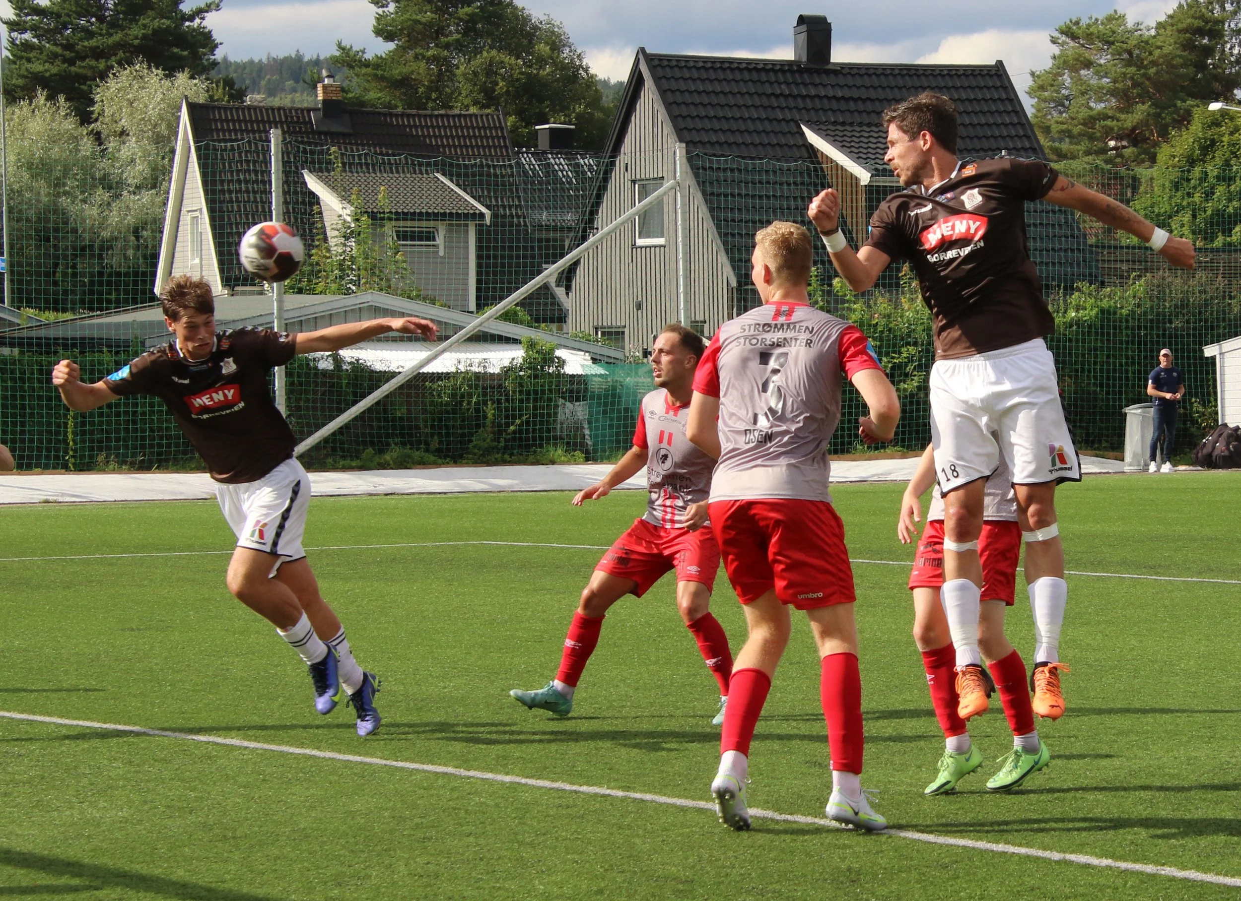 Henrik Falchener header inn 1-0 mot Strømmen i august 2022, etter at Arnar Førsund ikke har nådd helt opp