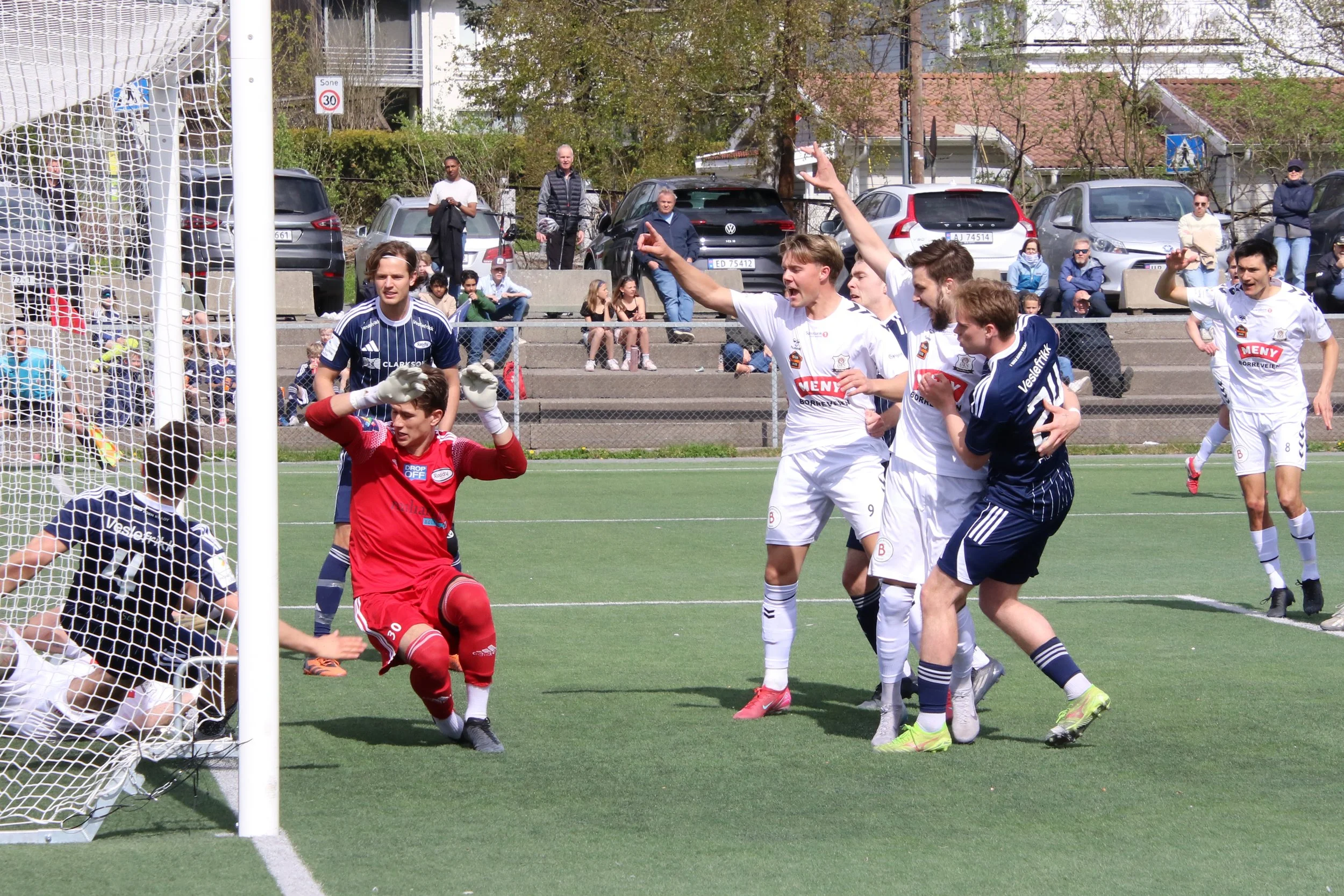 Christopher Lindquist (med den høyeste armen) setter inn 1-0 i våroppgjøret