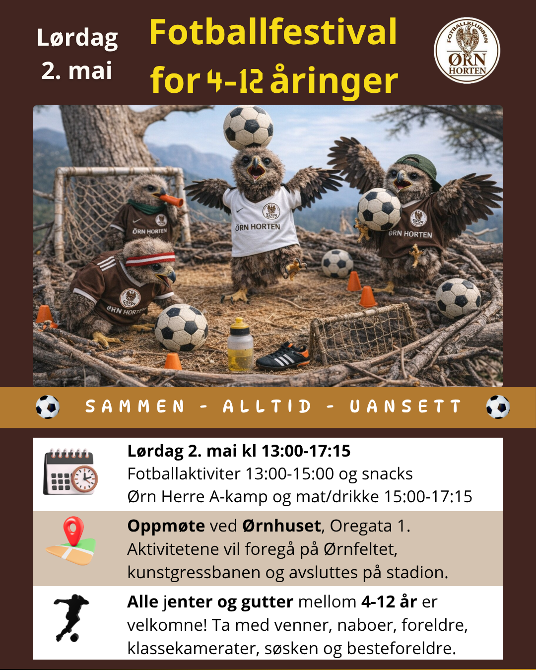 Lørdag 2. mai inviterer Ørn Horten til en spennende og inkluderende fotballfestival for barn i alderen 4 til 12 år. Arrangementet legger opp til en aktiv og sosial dag med fokus på lek, mestring og fellesskap.
