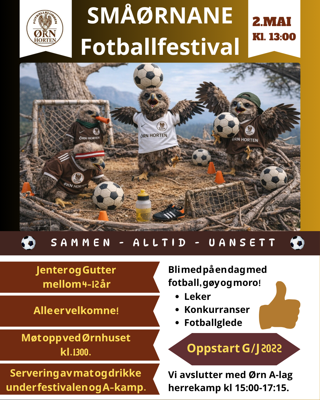 Lørdag 2. mai fra kl. 13-15 arrangerer Ørn Horten fotballfestival for jenter og gutter mellom 4–12 år. Det er bare å møte opp ved Ørnhuset kl. 13.