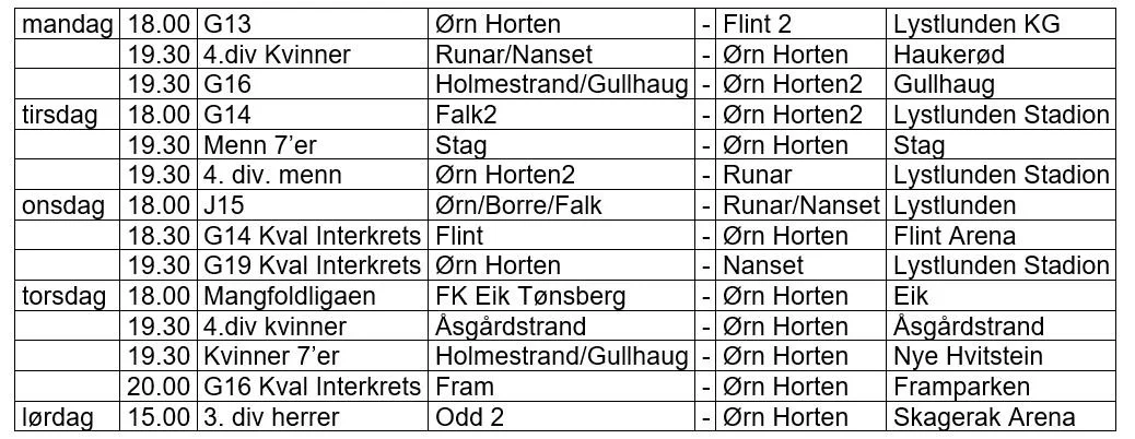 Det er 14 Ørn-kamper uka fram mot pinse. Mandag spiller A-lag kvinner mot Runar/Nanset som nok vil bety sterkere motstand enn i de siste kampene. Det er kun fire av kampene som går i Lystlunden, men du har mulighet til å oppleve Gutter13-laget til Pollen Solbakken på mandag, rekruttlaget i 4. divisjon på tirsdag samt samarbeidslaget Jenter 15 og Gutter19-laget til Ardian Gashi på onsdag.