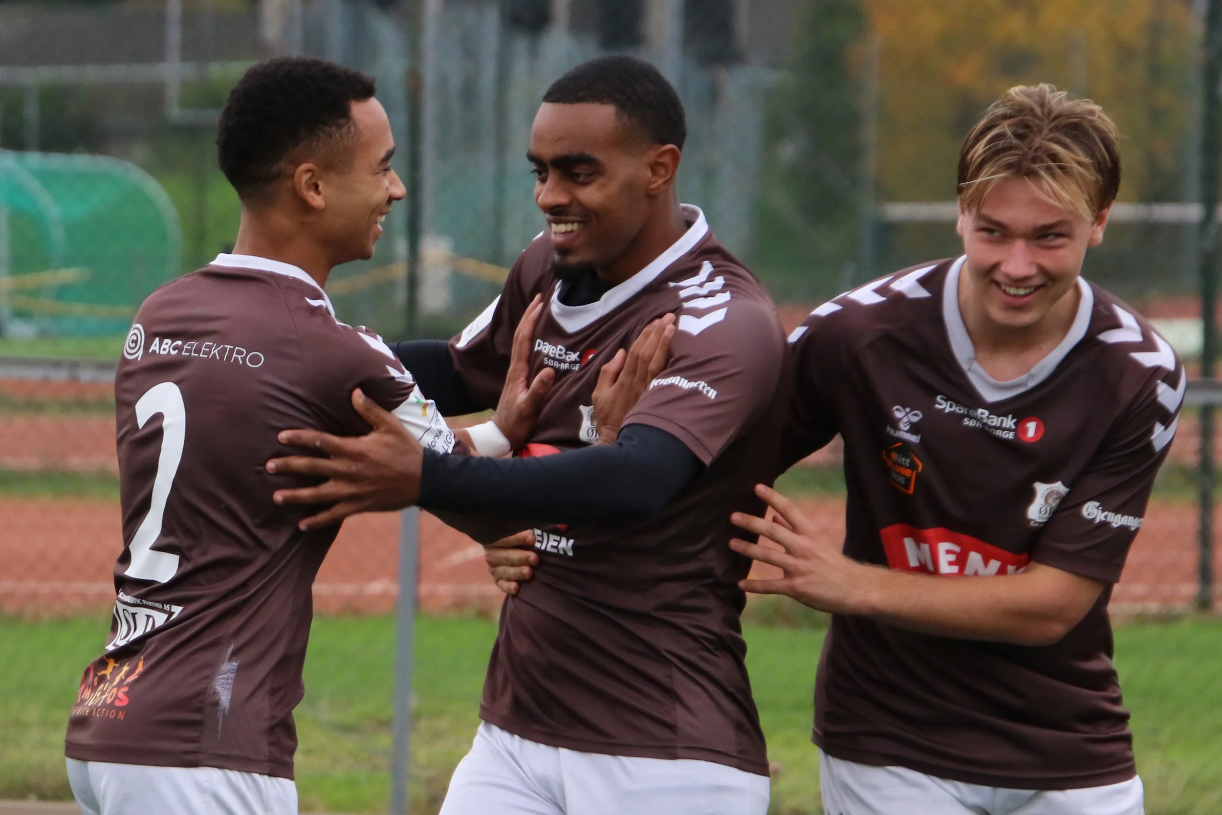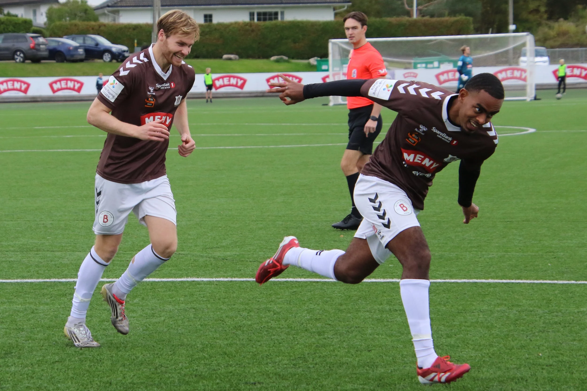 Leroy Nilsen og Johan Nilsen gratulerer Daniel Hamde med hans første spillemål i 2025