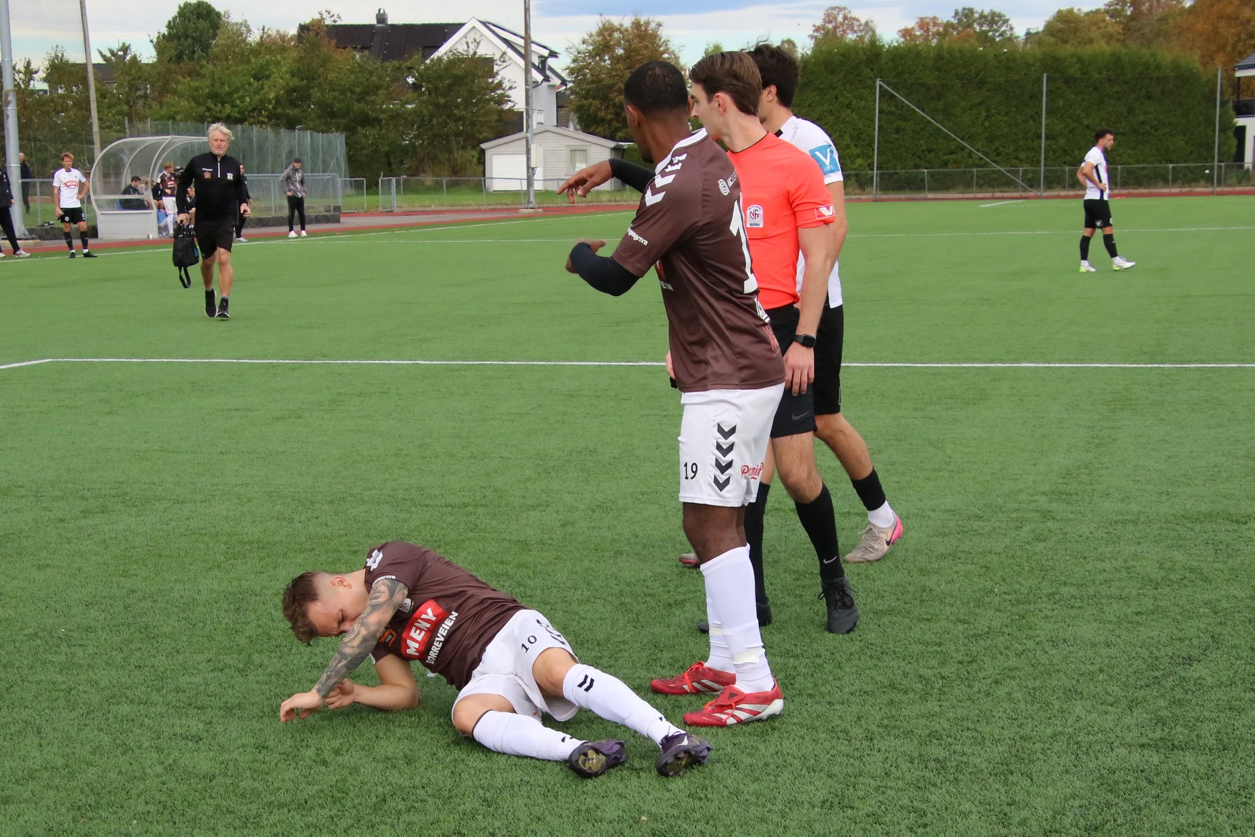 Keepertrener og pensjonert ambulansearbeider er på vei for å sjekke Alex Krawiec. Det endte med at han måtte forlate banen. Daniel Hamde prøver å forklare dommeren hva som har skjedd