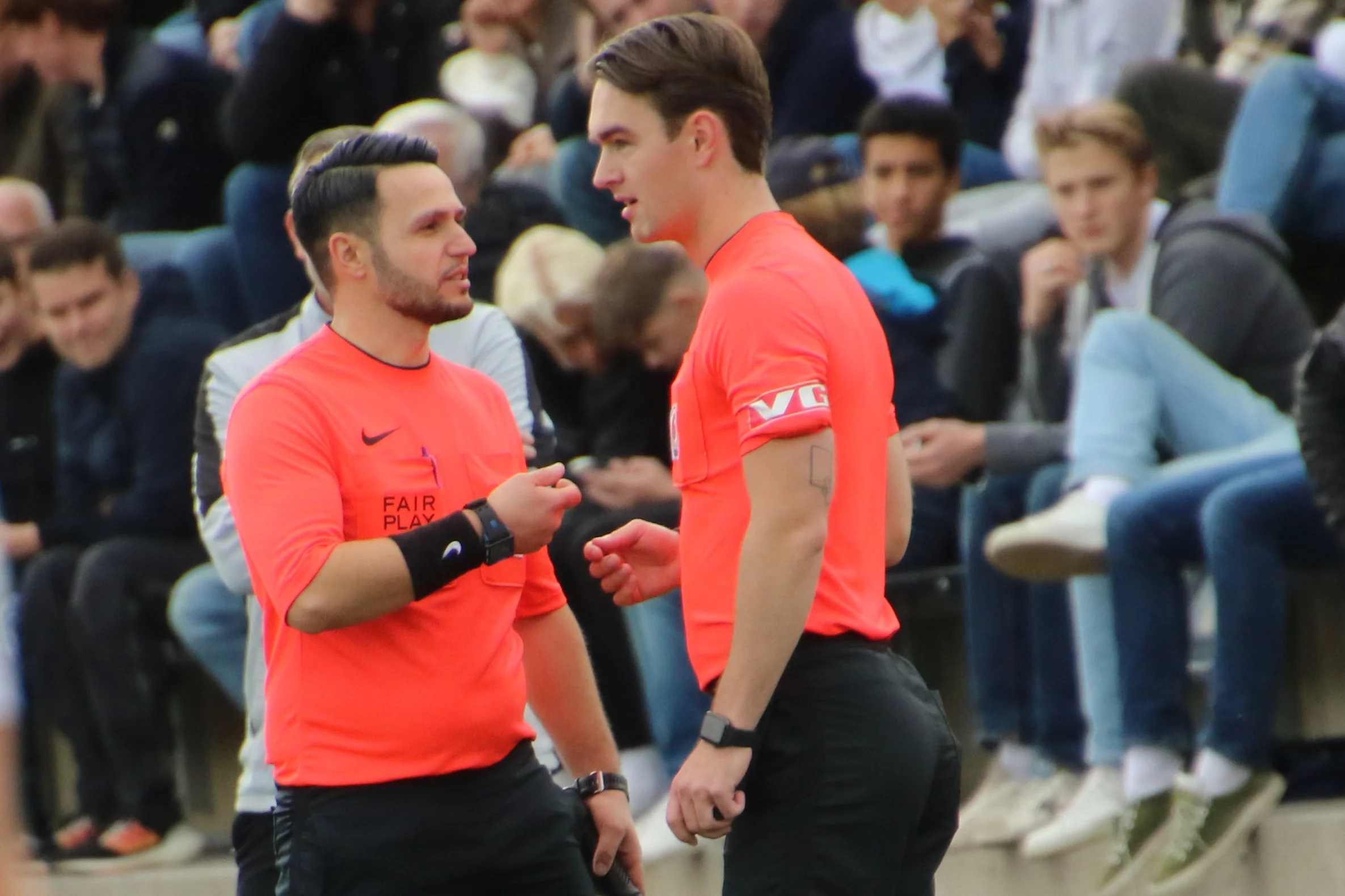 Dommer Marius Tvede Hansen konferer med assistentdommer Taulant Krivca uten å ta hensyn til hva som blei formidla