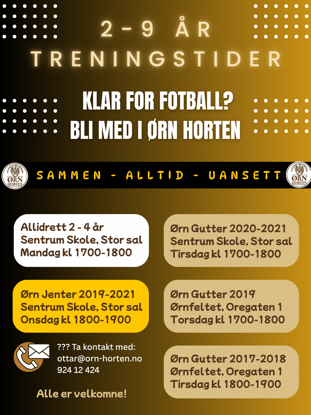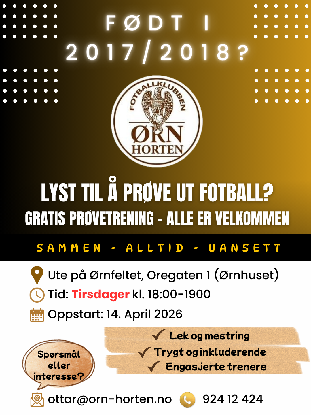 Hvis ditt barn er syv eller åtte år, dvs. født i 2017 eller 2018, er det prøvetrening på Ørnfeltet, ved Ørnhuset på tirsdager kl. 18-19.