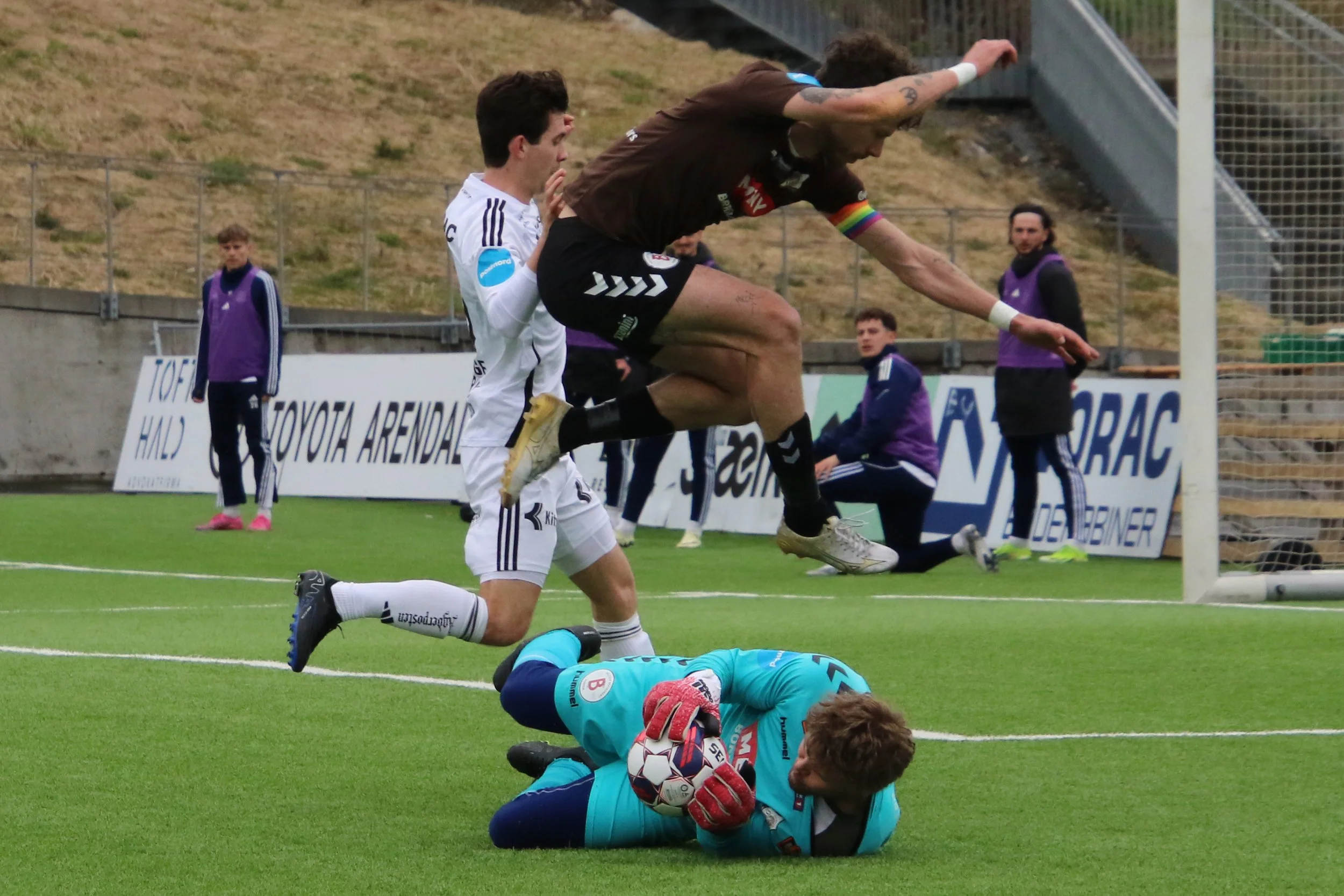 Kristoffer Solberg er tilbake i Ørn igjen, her redder han foran Arnar Førsund og en Arendalspiller i fjor.
