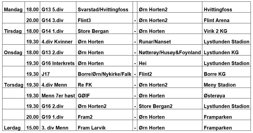 Fra mandag 16. til lørdag 20. september er det til sammen 12 kamper med Ørn-lag involvert.