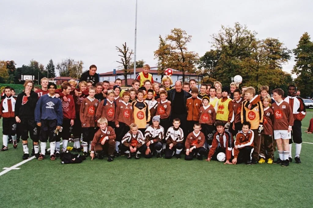 Daværende landslagssjef Nils Johan Semb var gjest på Miljøturneringa 2002 og sees i midten. Nåværende styreleder Morten Skogum står med Errea-overtrekk og svart lue til høyre