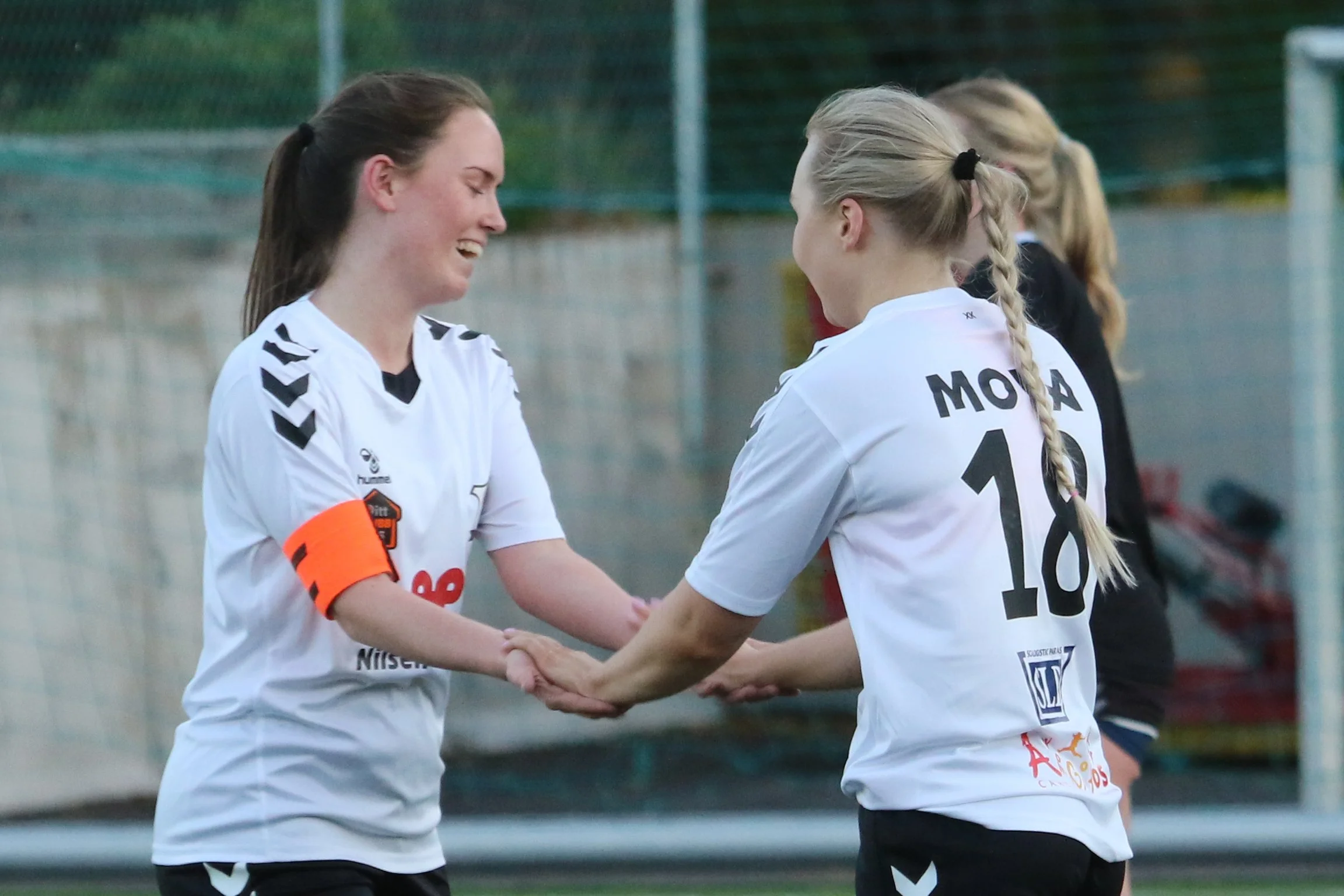 Kaptein Mia Elizabeth Hannevig gratulerer Stine Emilie Hytten-Andersen med en av hennes fire scoringer