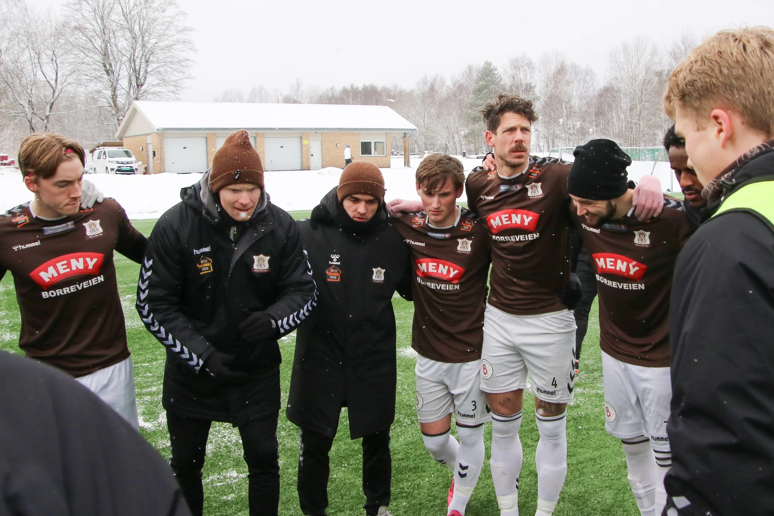 Det hender det er litt kjølig på de første treningskampene, her fra kampen mot Fram Larvik i februar i 2025