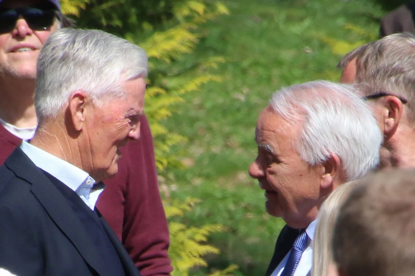 Roar Jalland i samtale med tidligere fotballpresident Per Ravn Omdal under avduking av Per Bredesen-statuen i Lystlunden