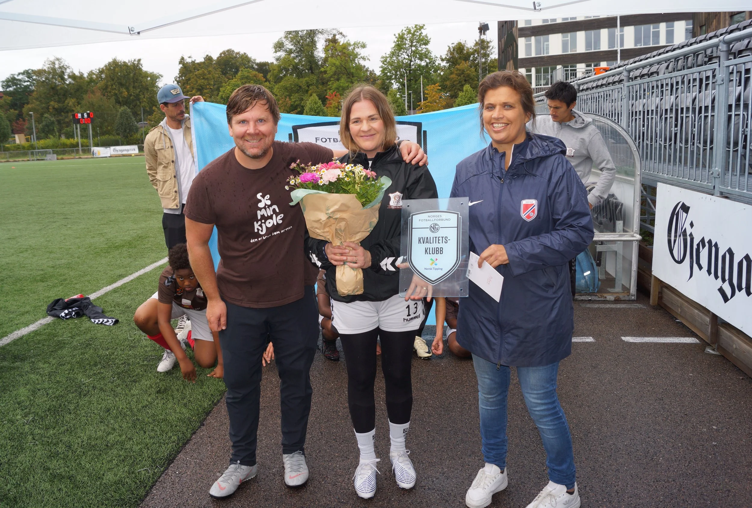 Line Johanne Bekkevold i midten sammen med styreleder Morten Skogum og Tonje Walle Egeli i NFF Vestfold